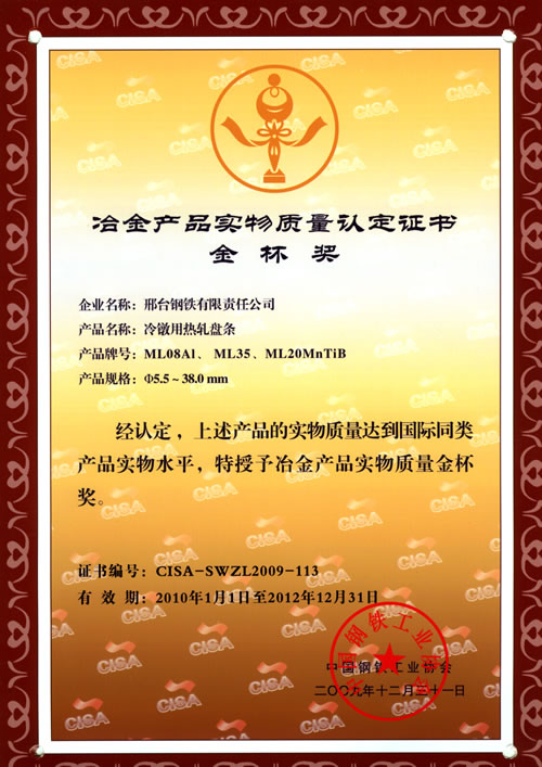 Wire ML08AL, ML35 and ML20MnTiB for cold forging awarded the Gold Cup Prize of Metallurgy products.