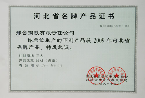 三人牌盤條被評為2009年河北省名牌產(chǎn)品
