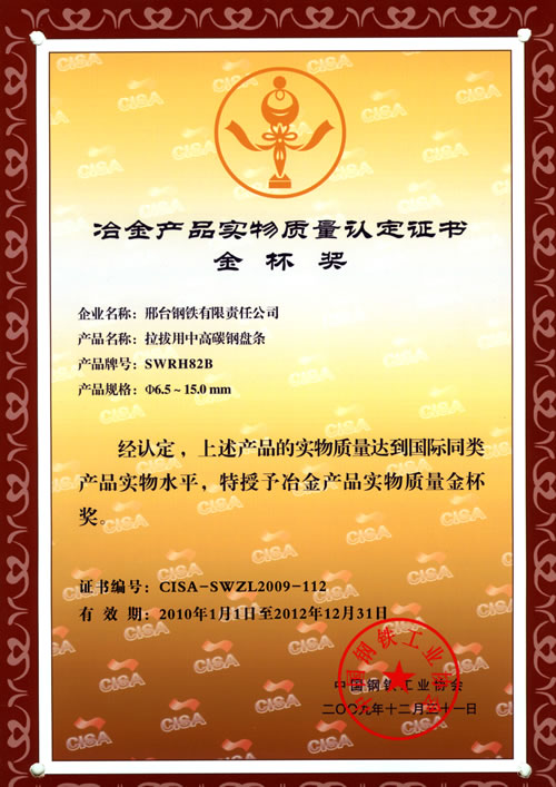 拉拔用中高碳鋼盤條SWRH82B獲冶金產(chǎn)品實物質(zhì)量金杯獎