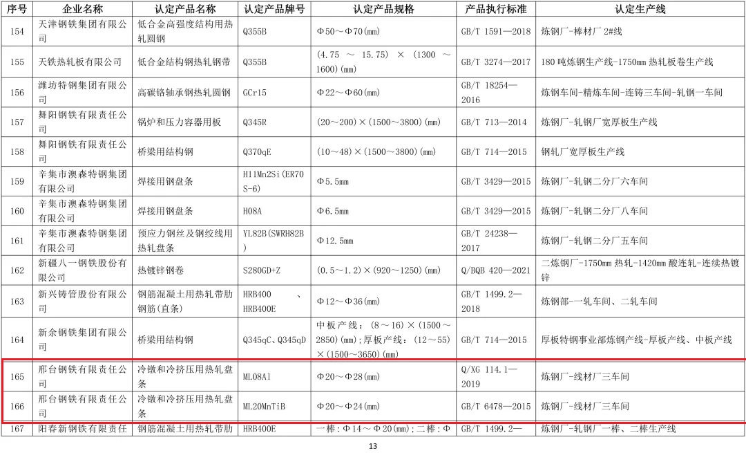 - 2024年1月24日,中國(guó)鋼鐵工業(yè)協(xié)會(huì)發(fā)布2023年度冶金產(chǎn)品實(shí)物質(zhì)量品牌培育產(chǎn)品名單公告,邢臺(tái)鋼鐵申報(bào)的《冷鐓和冷擠壓用熱軋盤(pán)條ML08Al》和《冷鐓和冷擠壓用熱軋盤(pán)條ML20MnTiB》獲冶金產(chǎn)品實(shí)物質(zhì)量品牌培育“金杯優(yōu)質(zhì)產(chǎn)品”。 至此,在合金冷墩鋼、簾線鋼、軸承鋼、焊接用鋼、預(yù)應(yīng)力、易切削鋼、耐候鋼種等應(yīng)用領(lǐng)域,邢鋼…