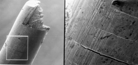 是一種階梯狀斷口,一般而言,橫向裂紋會離斷面很近,而且這些橫向的裂紋之間的距離很規(guī)則得分布在鋼絲的一側(cè),一般還伴有拉拔溝槽。