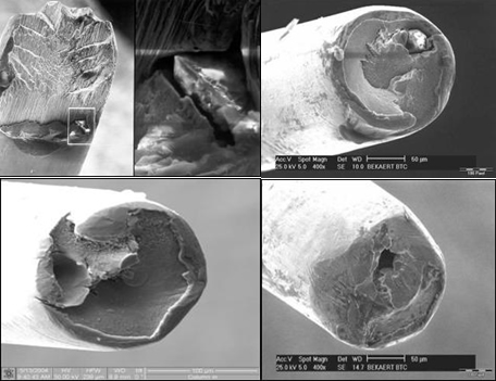 • 一般脆斷發(fā)生在濕拉的校直器和Bunching, 當(dāng)鋼絲在扭轉(zhuǎn)或者彎曲的時(shí)候,有內(nèi)含物的鋼絲就發(fā)生斷裂。