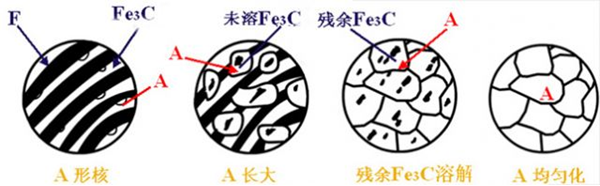 共析鋼奧氏體化:熱處理加熱至Ac1以上時,將全部奧氏體化,過程如下圖。