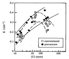 新日鐵名古屋廠的實(shí)踐證實(shí),預(yù)抽真空可以消除初始階段脫碳速率的滯止,使脫碳速率在RH開(kāi)始處理后迅速達(dá)到高的水平,如下圖所示。預(yù)抽真空循環(huán)開(kāi)始的時(shí)間要比沒(méi)有預(yù)抽縮短0.5min。