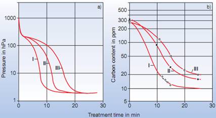 對(duì)于初始碳含量大約為0.03%,采用壓降方式Ⅰ在15min內(nèi)碳含量可以降到12×10-6,而采用壓降方式Ⅲ則只能降低到50×10-6 。