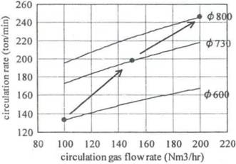 提高鋼水循環(huán)流量是加速RH脫碳的主要手段。提高提升氣體流量,增大浸漬管直徑,降低真空室壓力,均能增大循環(huán)流量,加速脫碳速率,其中浸漬管直徑變化的影響最大。浸漬管內(nèi)徑和提升氣體流量對(duì)循環(huán)流量的影響如下圖所示。