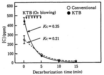 由上圖可以看出,脫碳處理初始階段采用KTB吹氧可以明顯提高脫碳速率。采用KTB和不采用KTB的表觀脫碳速率常數(shù)分別為0.35min-1、0.21min-1,而且由于采用KTB吹氧技術(shù)提高了脫碳速率,可以使脫碳處理時(shí)間縮短了3min。