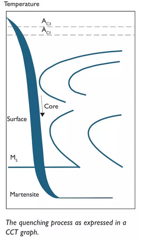 不良的淬火速率將導(dǎo)致在部件芯部的晶粒邊界處的碳化物沉淀,并且這對鋼的機(jī)械性能非常不利的。此外,對于具有較大橫截面的工具,較大部件的表面處所獲得的硬度可以比較小部件的更低,因?yàn)閺男静總鬟f至表面的大量熱量會產(chǎn)生自回火效應(yīng)。