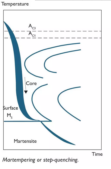 如今,用于合金鋼的淬火介質(zhì)有:硬化油、聚合物溶液、空氣和惰性氣體??諝庥不A粲糜诰哂懈叽阃感缘匿摚@在大多數(shù)情況下主要?dú)w因于錳、鉻和鉬的組合存在于鋼中。通過階梯淬火或者分級淬火可以減少變形和硬化裂紋的風(fēng)險(xiǎn)。在該方法中,材料在兩個(gè)步驟中淬火。首先,將其從硬化溫度冷卻直到表面的溫度剛好高于Ms溫度。然后必須保溫在那里直到表面和芯之間的溫度均衡。此后,冷卻過程繼續(xù)。這種方法允許芯和表面幾乎同時(shí)轉(zhuǎn)變成馬氏體并減少熱應(yīng)力。當(dāng)在真空爐中淬火時(shí),階梯淬火也是可能的。