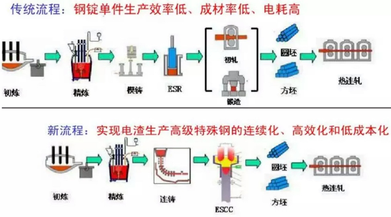 為解決電渣重熔技術(shù)電耗較高、批量少管理不便、生產(chǎn)效率低等局限性特點(diǎn),冶金工作者也在不斷的創(chuàng)新和完善電渣重熔技術(shù),如電渣連鑄技術(shù):