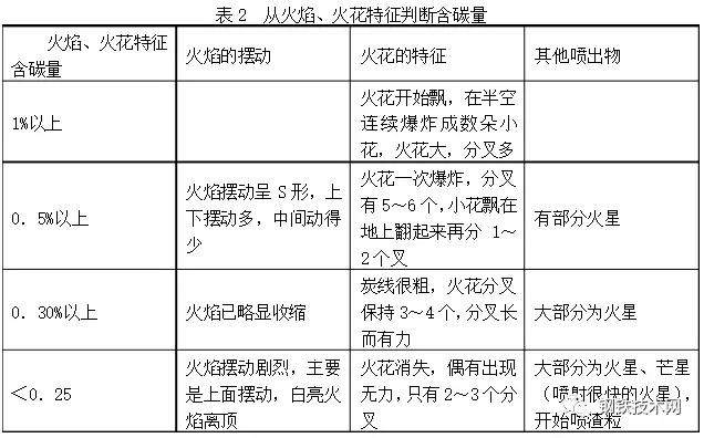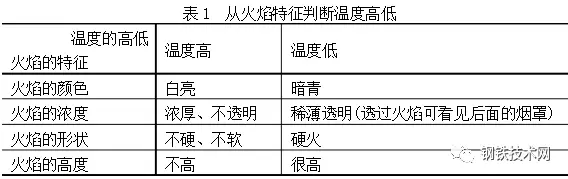 由上二表可見不能只憑一種“視覺信號”就判斷出爐內的情況,而是根據多種信號綜合判斷爐內情況,例如要從火焰的顏色、濃度、形狀、高度等來綜合判斷爐內溫度情況。在判斷終點含碳量時,既要看火花特征,還可考慮火焰形狀的變化。在收高碳時要看火焰擺動的幅度,由大至小,在收低碳時要看火焰下降情況。
