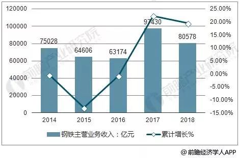 據(jù)前瞻產業(yè)研究院發(fā)布的《中國鋼鐵行業(yè)發(fā)展前景與投資戰(zhàn)略規(guī)劃分析報告》指出,2018上半年中國鋼鐵行業(yè)主營業(yè)務收入達到30525億元,累計增長15.8%?;仡?012-2017年鋼鐵行業(yè)營業(yè)收入情況:近六年來,我國鋼行業(yè)營業(yè)收入較為穩(wěn)定,2015年以來累計增長率逐漸回暖。中國鋼鐵行業(yè)將繼續(xù)保持穩(wěn)中有長趨勢,預計2018年中國鋼鐵行業(yè)營收將突破80000億元。
