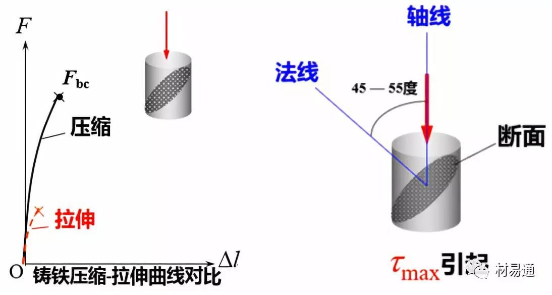 表明斷裂是由最大拉應(yīng)力引起的。而最大拉應(yīng)力先于最大剪應(yīng)力達(dá)到強度極限后發(fā)生斷裂又說明了鑄鐵的抗拉能力弱于其抗剪能力。