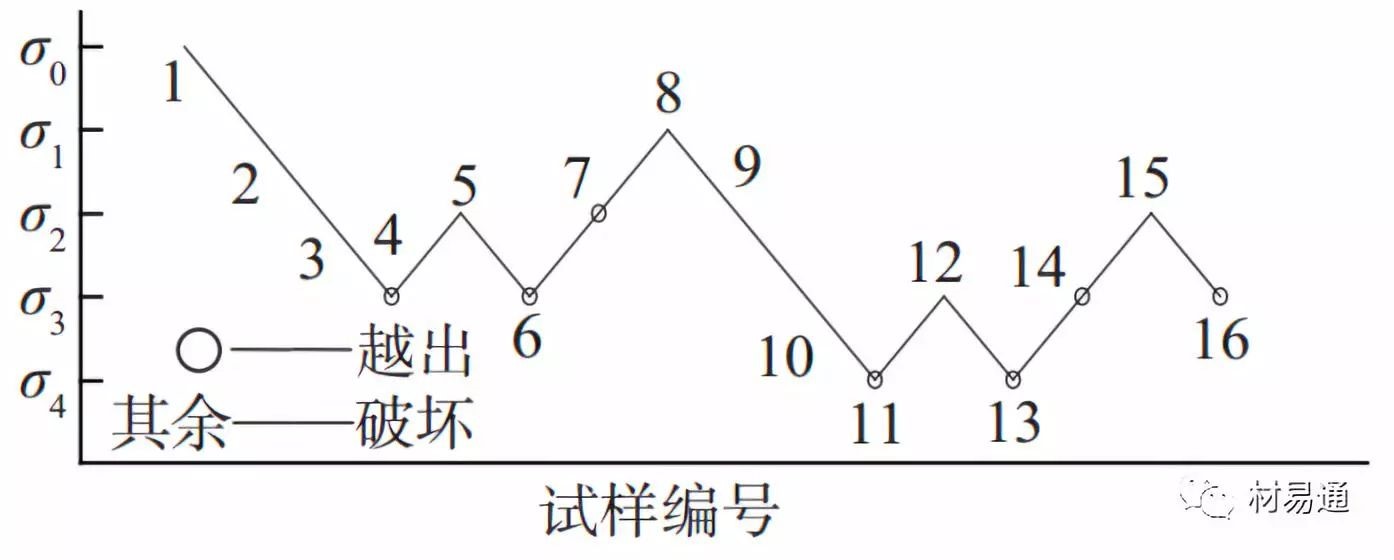 數(shù)據(jù)處理:當(dāng)N6<107次,疲勞極限在σ2與σ6之間,這時取σ7=1/2(σ2+σ6)再進(jìn)行試驗;當(dāng)N6>107次,取σ7=1/2(σ5+σ6)再進(jìn)行試驗。