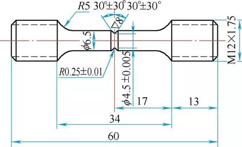 第三,試樣的制造。按圖沿材料的順纖維方向加工試樣,粗加工后熱處理至所要求的抗拉強(qiáng)度,然后精加工至規(guī)定尺寸,缺口用中軟細(xì)粒氧化鋁砂輪磨制。磨削時(shí)應(yīng)保證缺口根部半徑圓滑。磨削后投影檢查,確保缺口尺寸符合圖紙要求。逐根測(cè)量缺口根部直徑(圖中為φ4.5±0.05mm)的尺寸,并做好編號(hào)記錄。