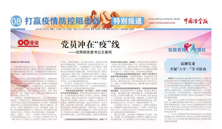 自新冠肺炎疫情發(fā)生以來,邢鋼黨員干部沖鋒在前,充分發(fā)揮基層黨組織戰(zhàn)斗堡壘作用和黨員先鋒模范作用,全力做好疫情防控各項(xiàng)工作,并把疫情防控作為踐行初心使命的戰(zhàn)場(chǎng),團(tuán)結(jié)帶領(lǐng)邢鋼全體員工迅速打響疫情防控阻擊戰(zhàn)。