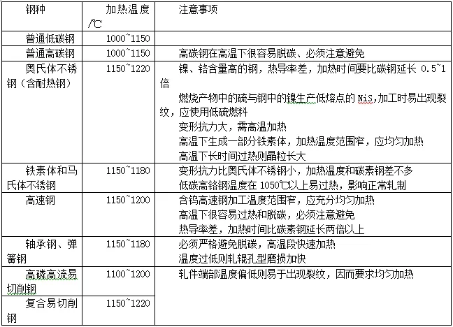特別注意的是:對于碳鋼加熱溫度一般不能大于1300℃,大于此溫度,其一,鋼坯表面的氧化鐵皮會(huì)熔化(純氧化鐵皮的熔點(diǎn)為1377~1565℃,含有雜質(zhì)時(shí)降到1300~1350℃),從鋼表面上掉下來,露出新的表面,燒損迅速增加。其二,當(dāng)加熱溫度大于1300℃時(shí),鋼坯很有可能會(huì)出現(xiàn)過熱或過燒。生產(chǎn)其它鋼種時(shí)更應(yīng)該注意最高加熱溫度。
