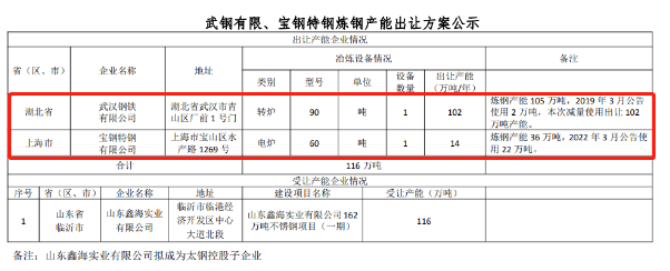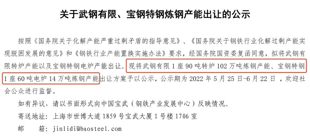 按照《國務(wù)院關(guān)于化解產(chǎn)能嚴重過剩矛盾的指導(dǎo)意見》、《國務(wù)院關(guān)于鋼鐵行業(yè)化解過剩產(chǎn)能實現(xiàn)脫困發(fā)展的意見》和《鋼鐵行業(yè)產(chǎn)能置換實施辦法》要求,經(jīng)國務(wù)院國資委復(fù)函同意,擬將武鋼有限轉(zhuǎn)爐產(chǎn)能以及寶鋼特鋼電爐產(chǎn)能出讓。現(xiàn)將武鋼有限1座90噸轉(zhuǎn)爐102萬噸煉鋼產(chǎn)能、寶鋼特鋼1座60噸電爐14萬噸煉鋼產(chǎn)能出讓方案予以公示,公示期為2022年5月25日-6月22日,歡迎社會公眾進行監(jiān)督。