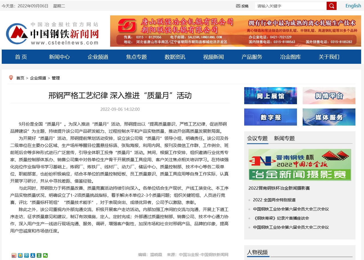 9月份是全國“質量月”。為深入推進“質量月”活動,邢鋼提出以“提高質量意識,嚴格工藝紀律,促進邢鋼品牌建設”為主題,持續(xù)提升該公司產品研發(fā)能力、過程控制水平和產品實物質量,推動開創(chuàng)高質量發(fā)展新局面。