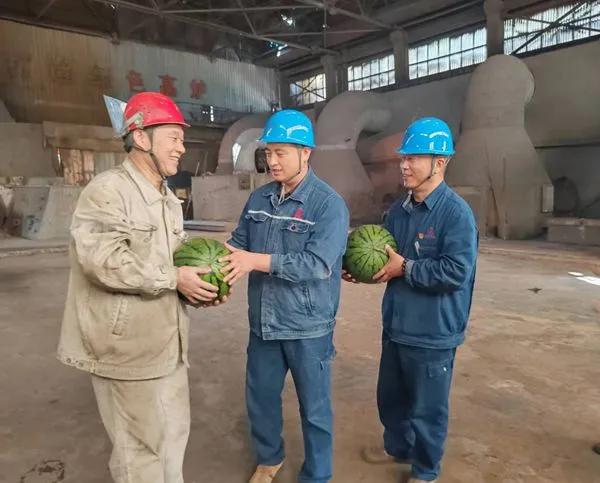 “天氣炎熱,大家辛苦了”,在爐前,侯副總親自把西瓜送到員工手里,并送上節(jié)日的祝福“端午安康!”希望大家在工作中注意做好防暑降溫,避免中暑,工作中合理分配體力,既要保證西場主溝澆筑過程安全,又要保證東場單場出鐵過程安全。在二燒混合機檢修現(xiàn)場,侯總了解檢修進度,叮囑維修、燒結車間主任,要注意檢修過程人員安全,保證檢修質量,為二燒設備穩(wěn)定運行奠定基礎。
