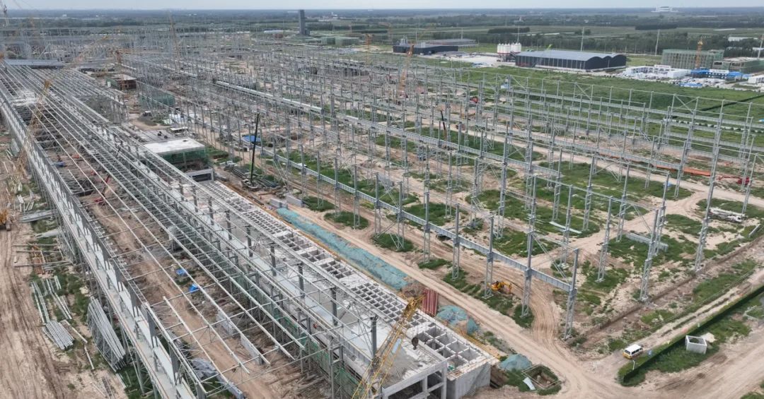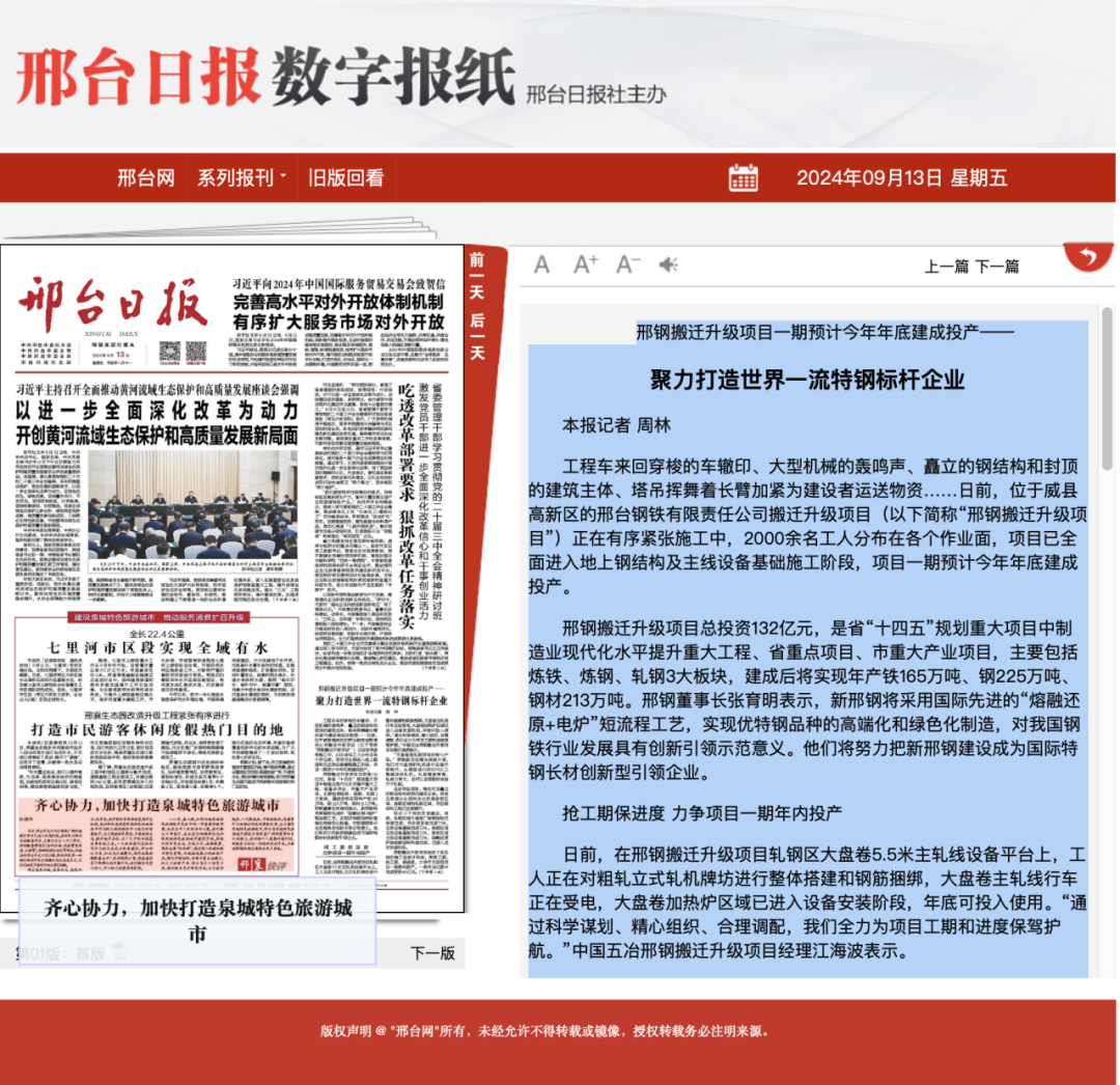 工程車來回穿梭的車轍印、大型機械的轟鳴聲、矗立的鋼結構和封頂的建筑主體、塔吊揮舞著長臂加緊為建設者運送物資……日前,位于威縣高新區(qū)的邢臺鋼鐵有限責任公司搬遷升級項目(以下簡稱“邢鋼搬遷升級項目”)正在有序緊張施工中,2000余名工人分布在各個作業(yè)面,項目已全面進入地上鋼結構及主線設備基礎施工階段,項目一期預計今年年底建成投產。