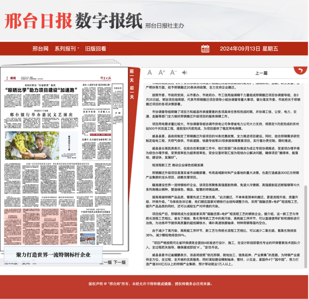 邢鋼搬遷升級項目是落實省市戰(zhàn)略部署,布局縣域新材料產業(yè)基地的重大決策,也是打造威縣300億元特鋼產業(yè)集群的龍頭項目、戰(zhàn)略支撐項目。 瞄準建設世界一流特鋼標桿企業(yè),該項目將聚焦高強度耐熱鋼、免退火冷鐓鋼、高強度耐延遲斷裂鋼等10大系列高精尖鋼種,塑造綠色、精品、智慧的特鋼品牌。