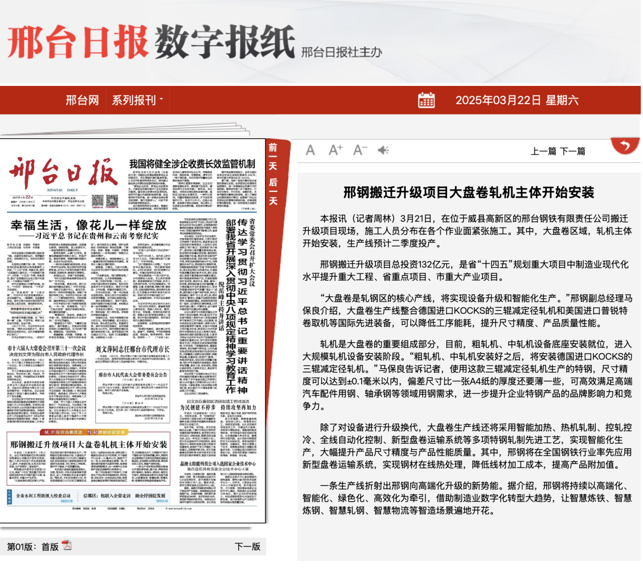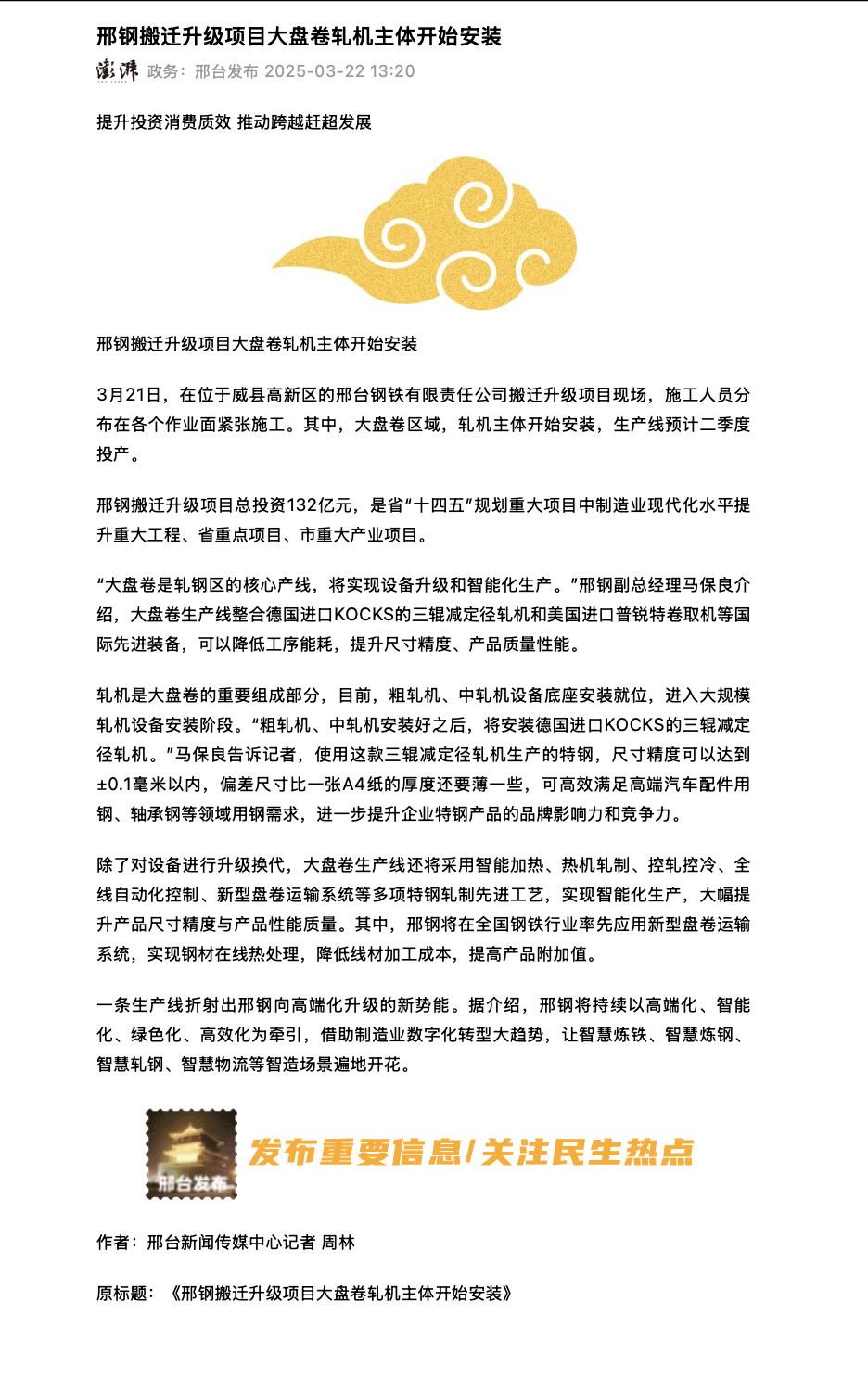 邢鋼搬遷升級項(xiàng)目總投資132億元,是省“十四五”規(guī)劃重大項(xiàng)目中制造業(yè)現(xiàn)代化水平提升重大工程、省重點(diǎn)項(xiàng)目、市重大產(chǎn)業(yè)項(xiàng)目。 “大盤卷是軋鋼區(qū)的核心產(chǎn)線,將實(shí)現(xiàn)設(shè)備升級和智能化生產(chǎn)。”邢鋼副總經(jīng)理馬保良介紹,大盤卷生產(chǎn)線整合德國進(jìn)口KOCKS的三輥減定徑軋機(jī)和美國進(jìn)口普銳特卷取機(jī)等國際先進(jìn)裝備,可以降低工序能耗,提升尺寸精度、產(chǎn)品質(zhì)量性能。