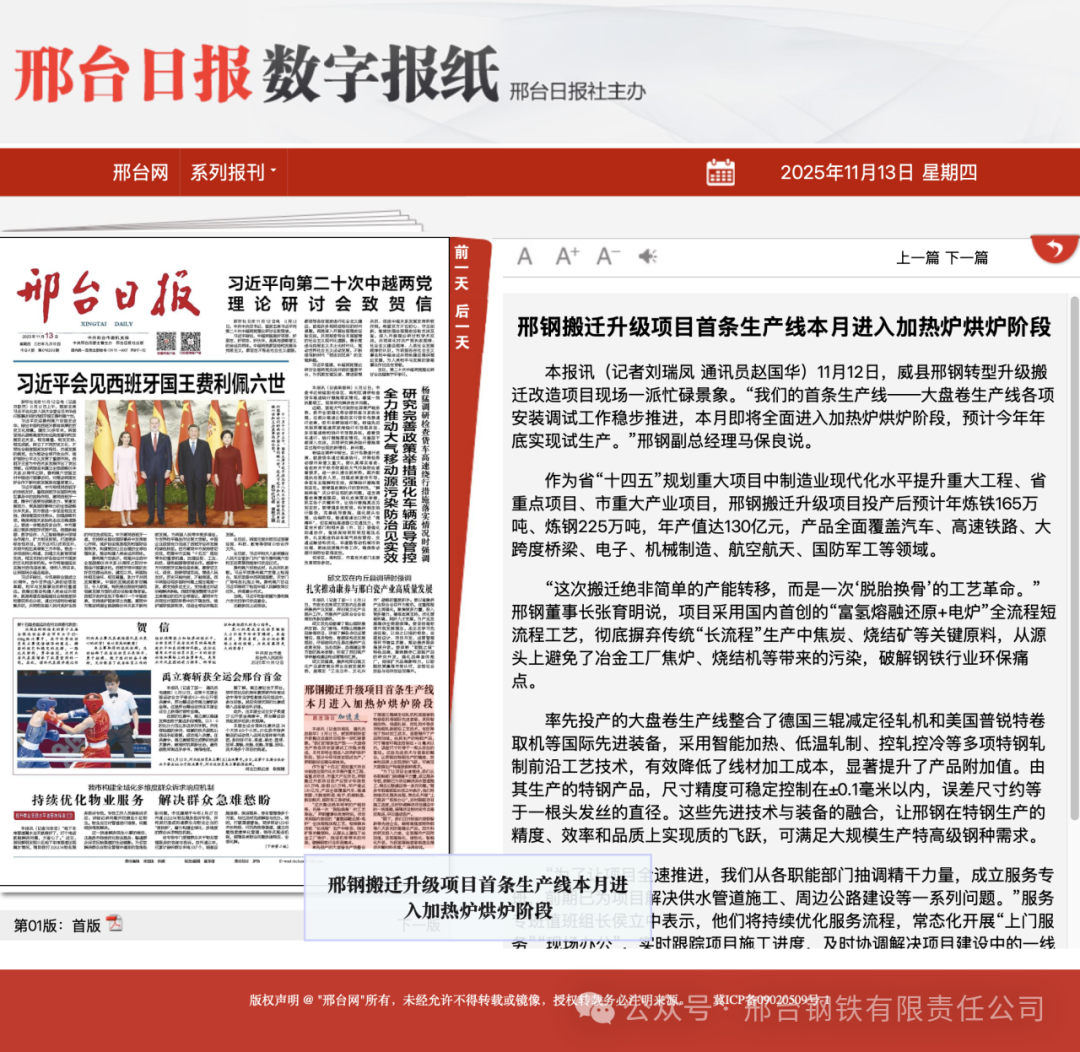 率先投產(chǎn)的大盤卷生產(chǎn)線整合了德國(guó)三輥減定徑軋機(jī)和美國(guó)普銳特卷取機(jī)等國(guó)際先進(jìn)裝備,采用智能加熱、低溫軋制、控軋控冷等多項(xiàng)特鋼軋制前沿工藝技術(shù),有效降低了線材加工成本,顯著提升了產(chǎn)品附加值。由其生產(chǎn)的特鋼產(chǎn)品,尺寸精度可穩(wěn)定控制在±0.1毫米以內(nèi),誤差尺寸約等于一根頭發(fā)絲的直徑。這些先進(jìn)技術(shù)與裝備的融合,讓邢鋼在特鋼生產(chǎn)的精度、效率和品質(zhì)上實(shí)現(xiàn)質(zhì)的飛躍,可滿足大規(guī)模生產(chǎn)特高級(jí)鋼種需求。“為了讓項(xiàng)目全速推進(jìn),我們從各職能部門抽調(diào)精干力量,成立服務(wù)專班,前期已為項(xiàng)目解決供水管道施工、周邊公路建設(shè)等一系列問(wèn)題。”服務(wù)專班值班組長(zhǎng)侯立中表示,他們將持續(xù)優(yōu)化服務(wù)流程,常態(tài)化開展“上門服務(wù)”“現(xiàn)場(chǎng)辦公”,實(shí)時(shí)跟蹤項(xiàng)目施工進(jìn)度,及時(shí)協(xié)調(diào)解決項(xiàng)目建設(shè)中的一線難題,保障項(xiàng)目按時(shí)間節(jié)點(diǎn)高效推進(jìn),早日建成投產(chǎn)。“眼下,我們正對(duì)標(biāo)國(guó)內(nèi)首鋼智新等先進(jìn)企業(yè),瞄準(zhǔn)高強(qiáng)度耐熱鋼等八大系列的高精尖產(chǎn)品,加大科技研發(fā)投入力度,全面提升產(chǎn)品附加值,實(shí)現(xiàn)高端化、綠色化、智能化升級(jí),為我國(guó)高端裝備制造業(yè)提供關(guān)鍵材料支撐。”馬保良說(shuō)。