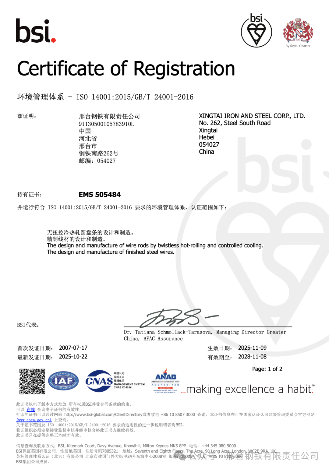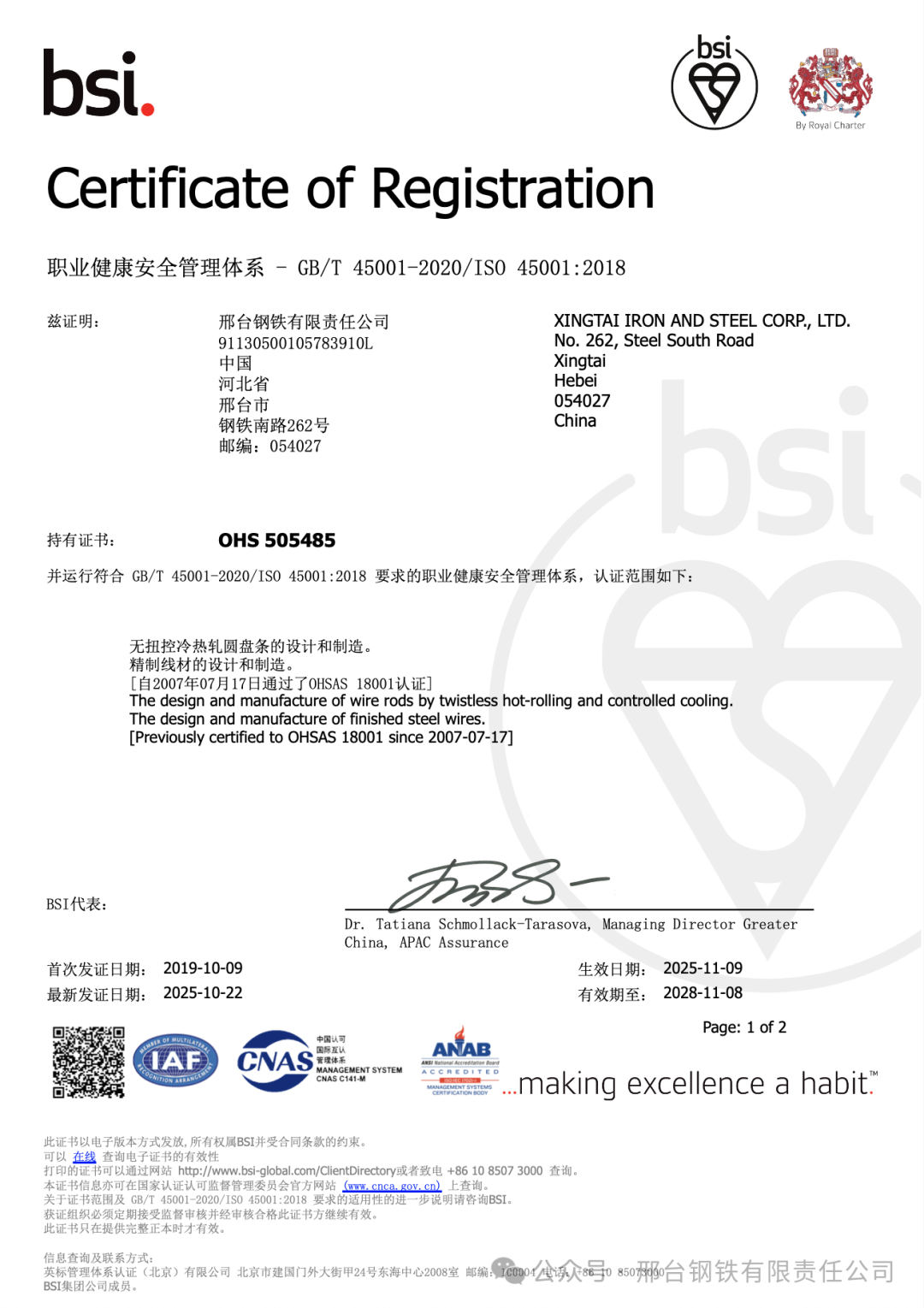 Recently, Xingtai Iron and Steel Co., Ltd. (hereinafter referred to as "Xingtai Steel") successfully passed the recertification audit of its Occupational Health and Safety Management System and Environmental Management System conducted by the British Standards Institution (BSI), and obtained the new version of the certification certificates. Since first obtaining the system certification in 2007, the company has maintained the continuous and effective operation of the systems for 18 consecutive years, demonstrating its long-term and stable compliance capability and management resilience in safety and environmental management.